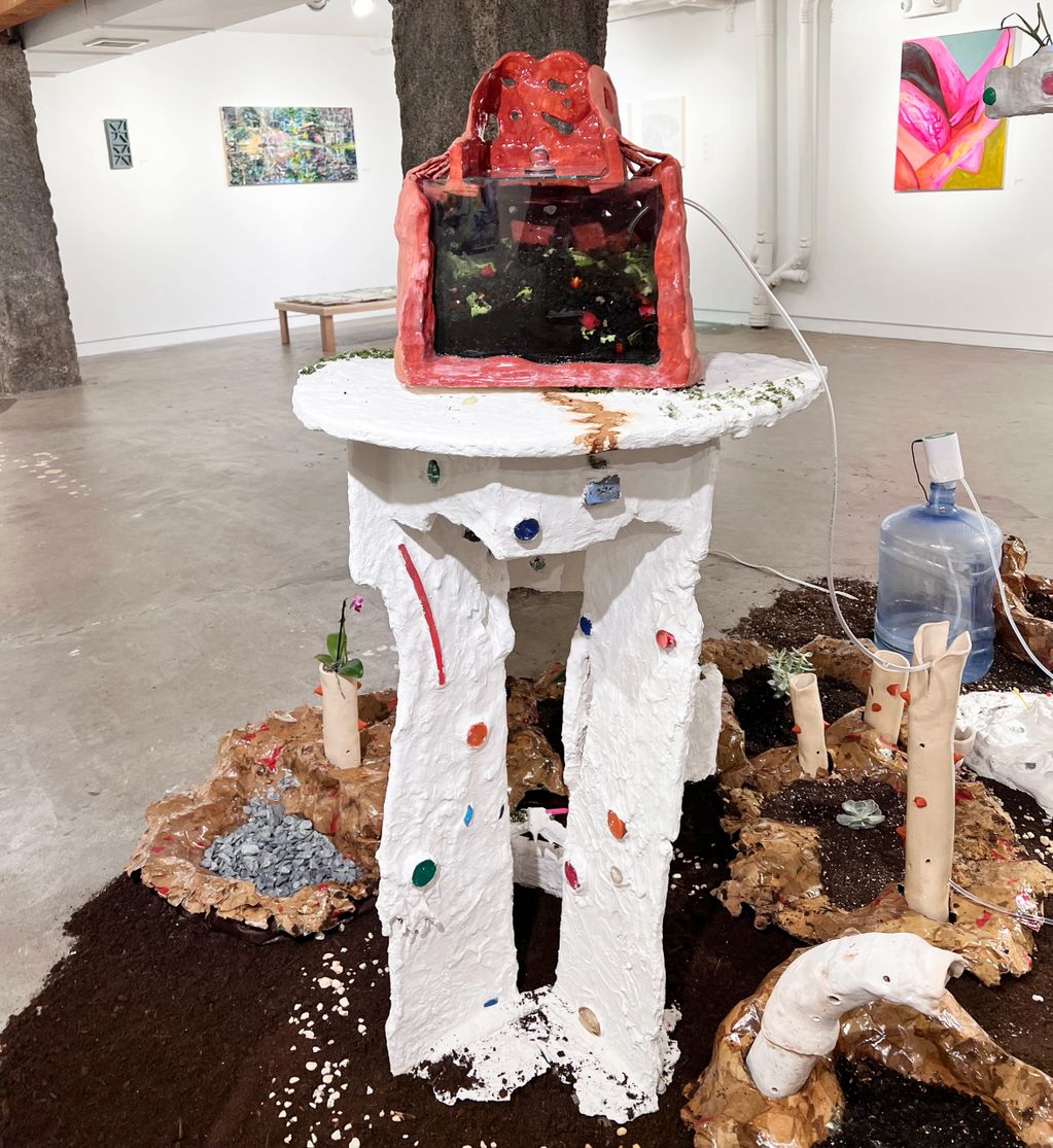 The installation “The Trail to Eden Garden” is the artist’s imaginary utopia and dystopia rooted in an ongoing interest to shift the relationship between humans, nature, and technology. The installation was built with waste materials such as cardboard, water-decayed plastic pieces, and brown paper bags. It coexists with biodegradable, eco-friendly materials such as pestalotiopsis microspora (a plastic-eating mushroom), blood-worms composting within a ceramic pod, and living plants. The theoretical system proposes environmentally sustainable living practices while still acknowledging the presence of dysfunctional residents and conditions. The restorative making process and continual supervision require performative human labor, which has a significant role in maintaining the system.